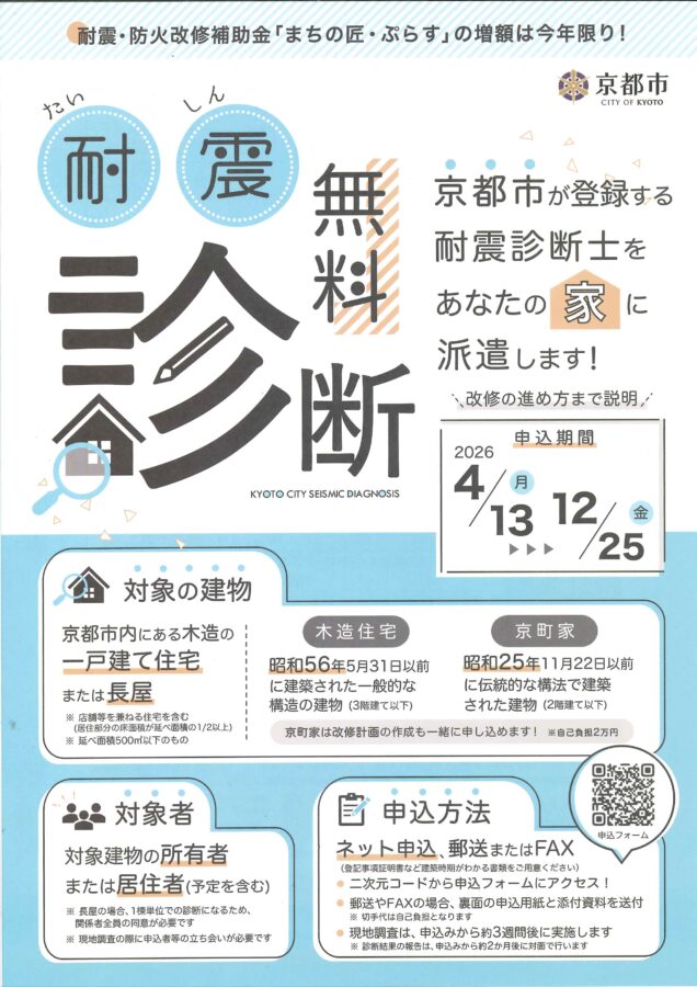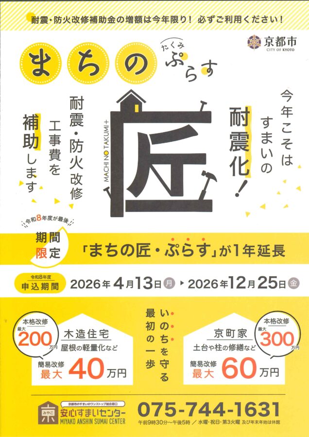 京都市耐震リフォーム補助金「まちの匠ぷらす」申込みスタート!
